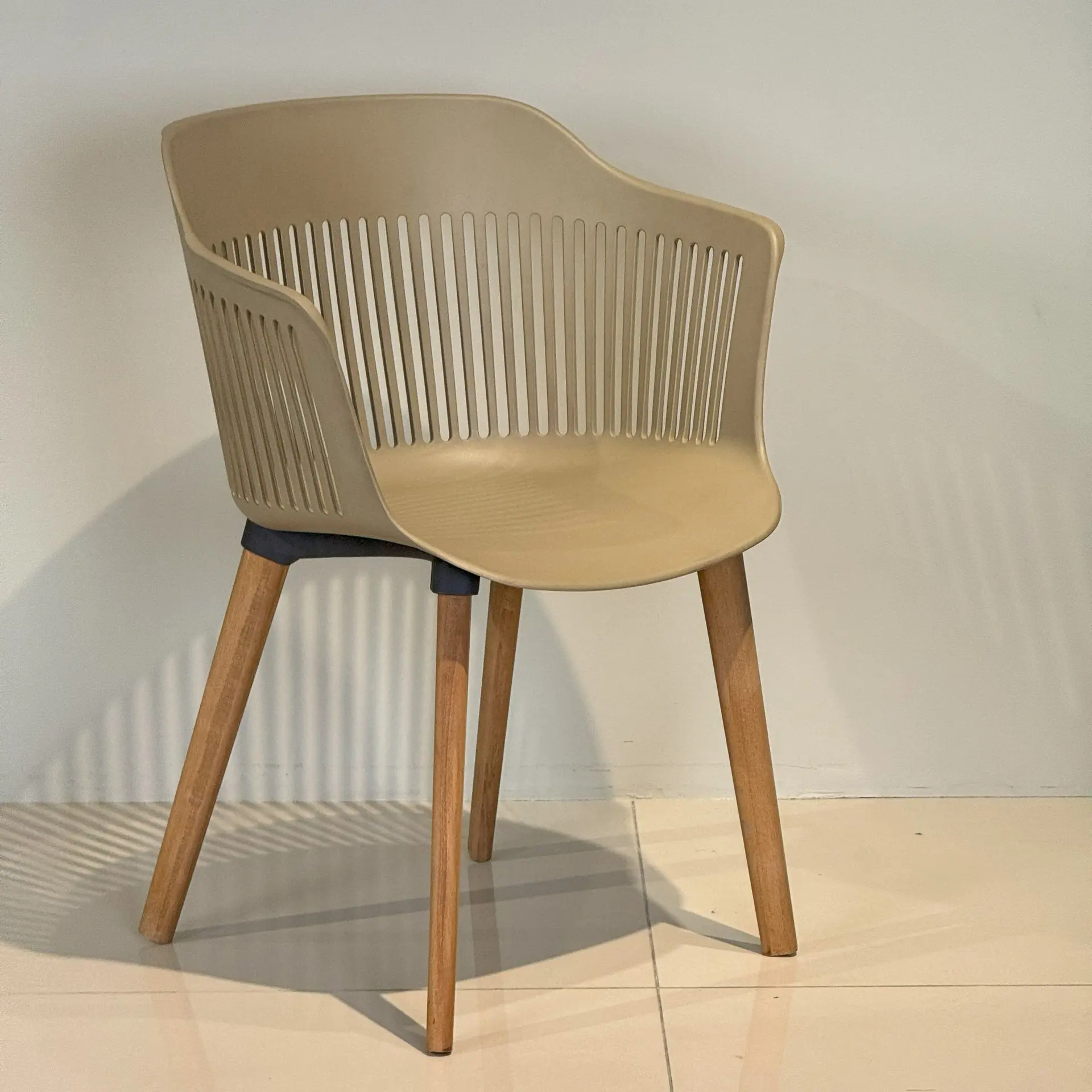 A celebration of airflow and form, the AERIS CHAIR pairs a sculpted, slatted polypropylene shell with warm tapered wooden legs, merging modern minimalism with natural elegance. The open ribbed backrest promotes ventilation and visually lightens the silhouette, while the ergonomically contoured seat and sturdy frame ensure everyday durability—perfect for cafés, patios, and creative interiors seeking fuss-free style. PROUDLY CRAFTED IN OVI FACTORY